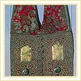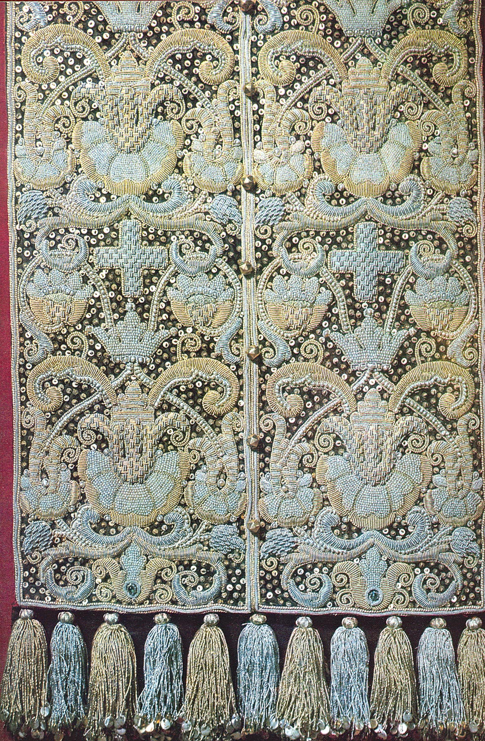 | Жемчужная епитрахиль с финифтяными дробницами (вклад боярина Б. И. Сукина в Троице-Сергиев монастырь). Дробницы - Новгород. Конец 14 века. Епитрахиль - Москва. 15 век. Загорский историко