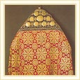 Атлас, жемчуг, пряденые, золотные нити, драгоценные камни, шитье, литье, чеканка. Атлас золотный - Турция, 17 в. Шитье жемчугом - Россия, середина 17 в.
