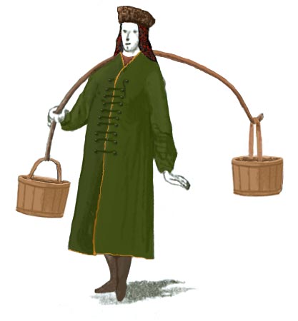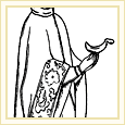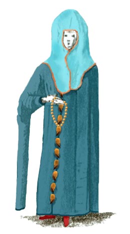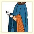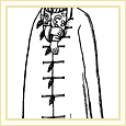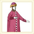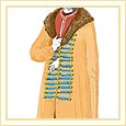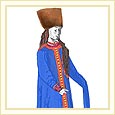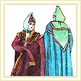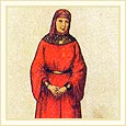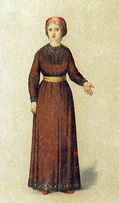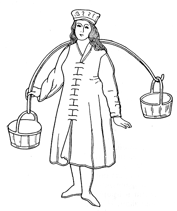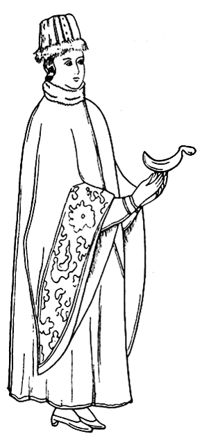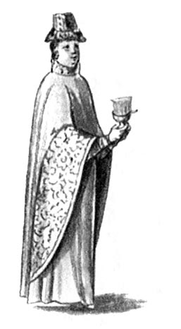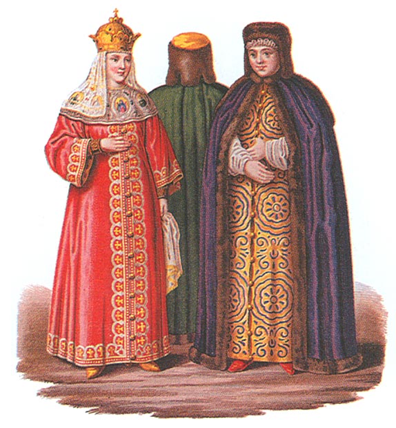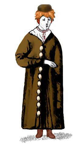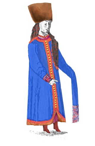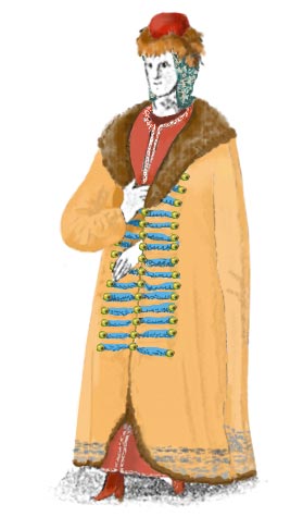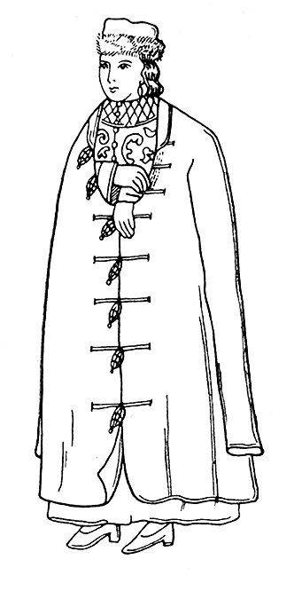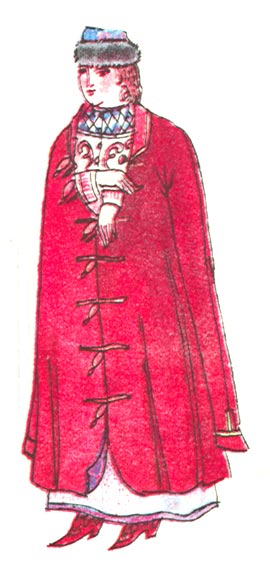 (раскрашено). На рисунке видно, что шуба надета мехом вовнутрь и имеет очень длинные рукава, что, с одной стороны, считалось признаком знатности, а с другой - надежно защищало руки от холода. |