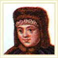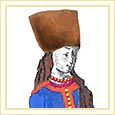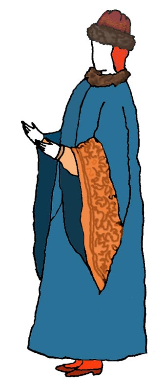(раскрашено). Горожанка одета в сарафан или шубу. На голове у нее медвежья шапка. |