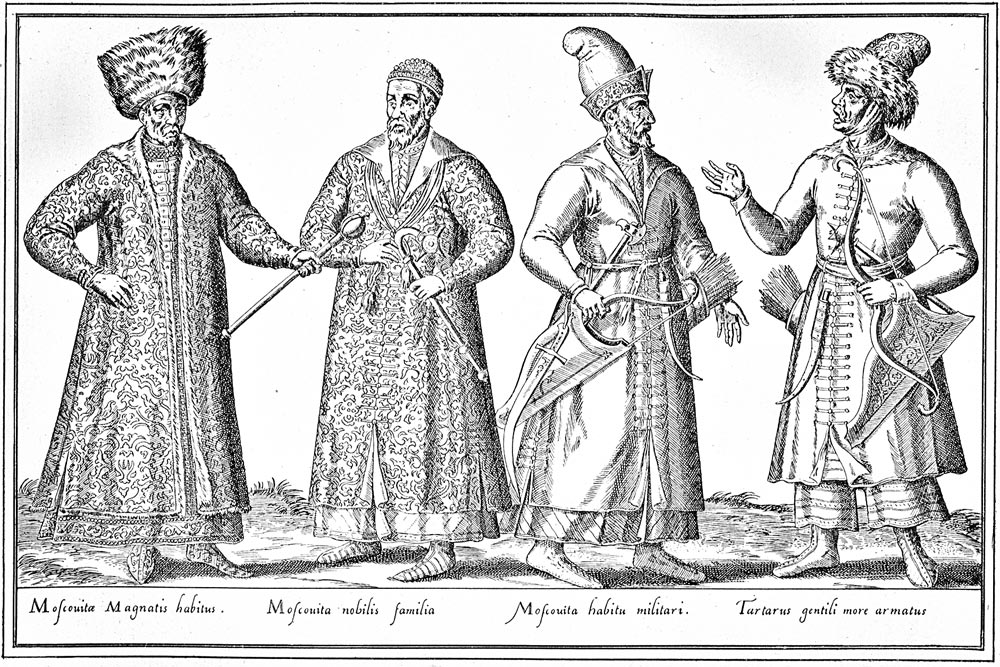 Из книги Ровинского "Материалы для русской иконографии". Вып. 6. Перевод надписей (слева направо): Одеяние Московского магната. Знатный Московит. Московит в воинском одеянии. Татарин в своем туземном вооружении