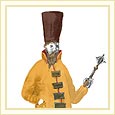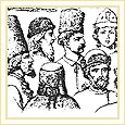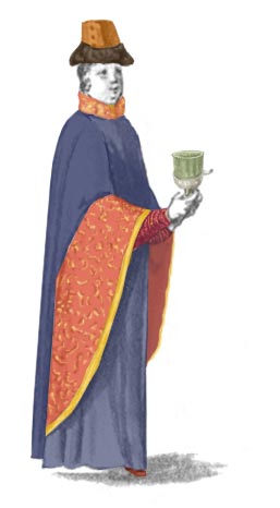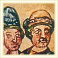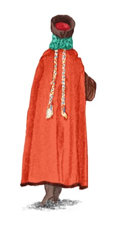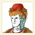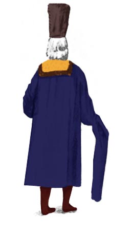 (раскрашено). На князе характерная для знатного человека одежда с непомерно длинными рукавами и высокая горлатная шапка |