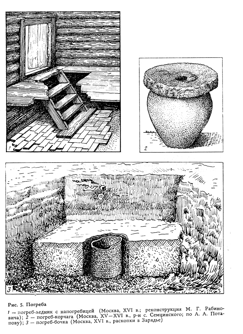1 - погреб-ледник с напогребицей (Москва, XVI в.; реконструкция Г. Рабиновича); 2 - погреб-корчага (Москва, XV —XVI в., р-н с. Семцинского; по А. А. Потапову); 3 - погреб-бочка (Москва, XVI в., раскопки в Зарядье)