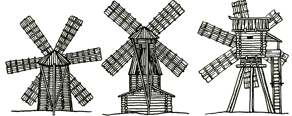 Мельницы ветряные разных типов.
