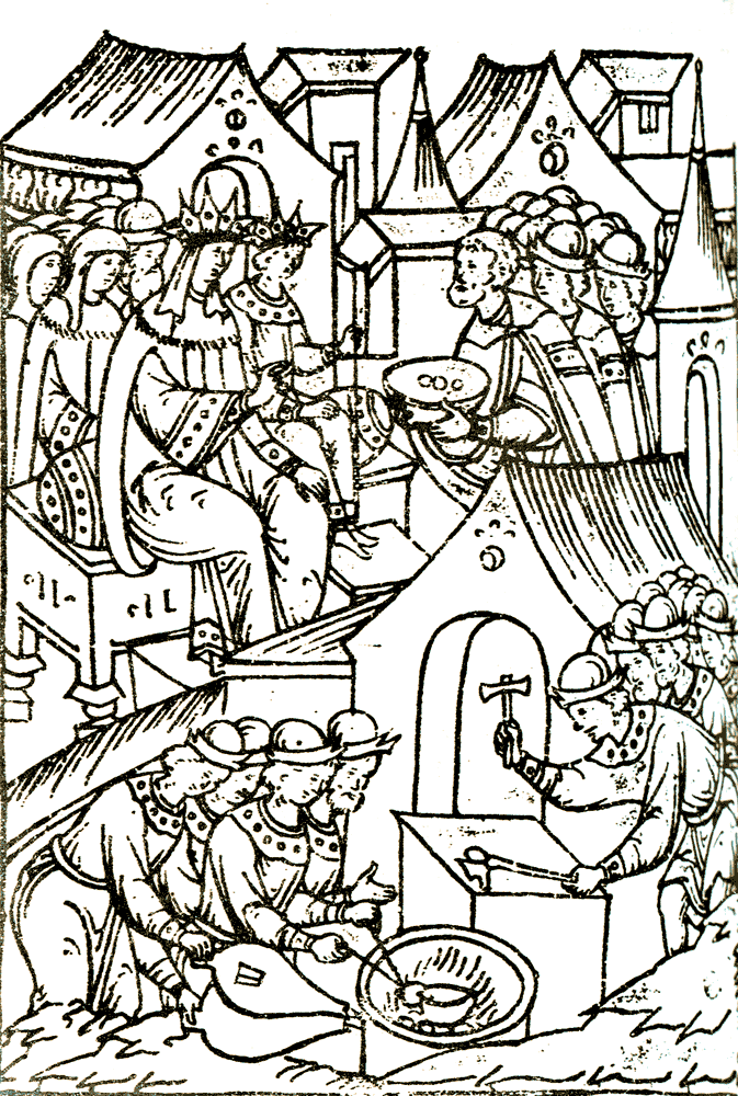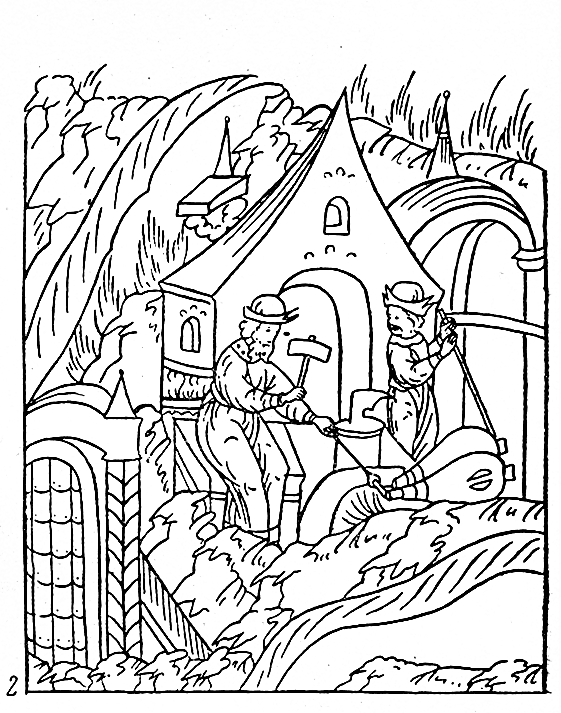 Василий Осипов с товарищами. Кузница. Миниатюра рукописи "Александрия". 1673