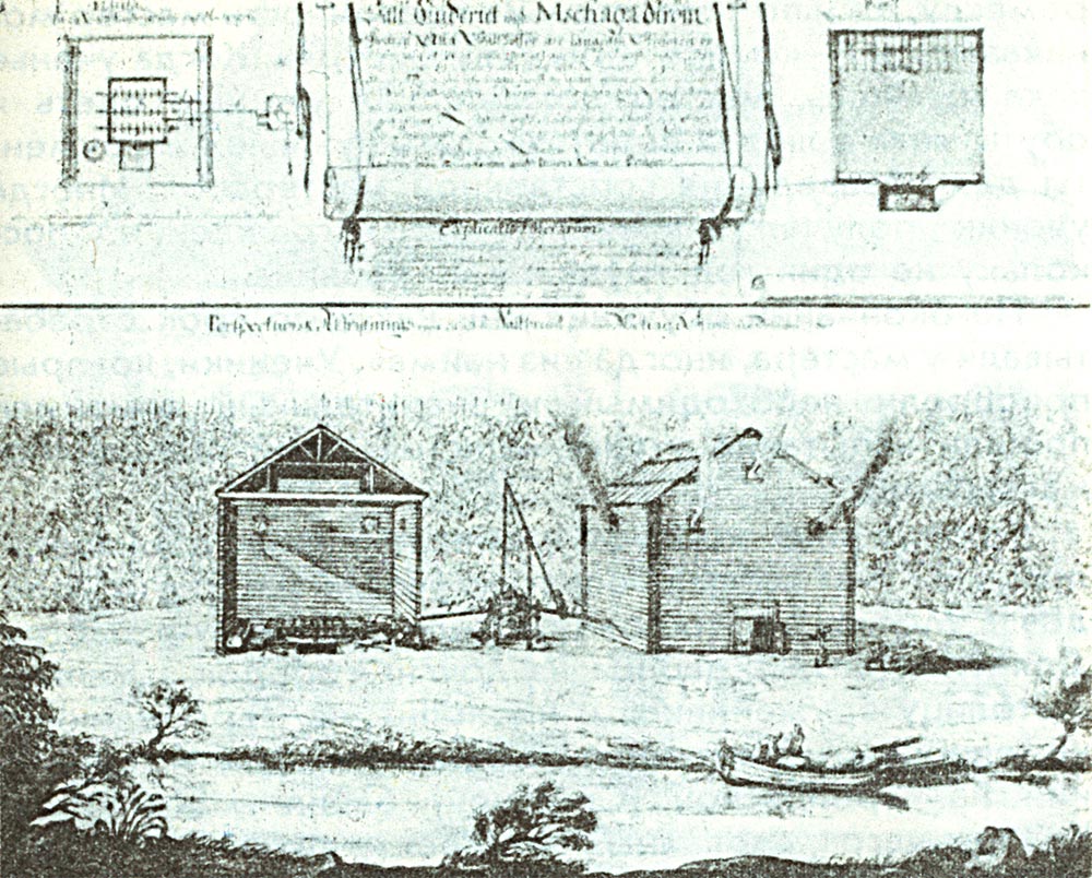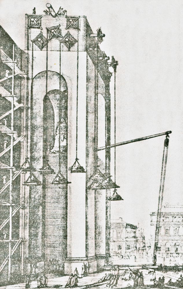 Из книги Э. Пальмквиста. 1674 г. Уникальное средневековое изображение способа подъема на колокольню при помощи воротов и противовесов гигантского колокола