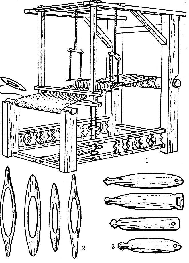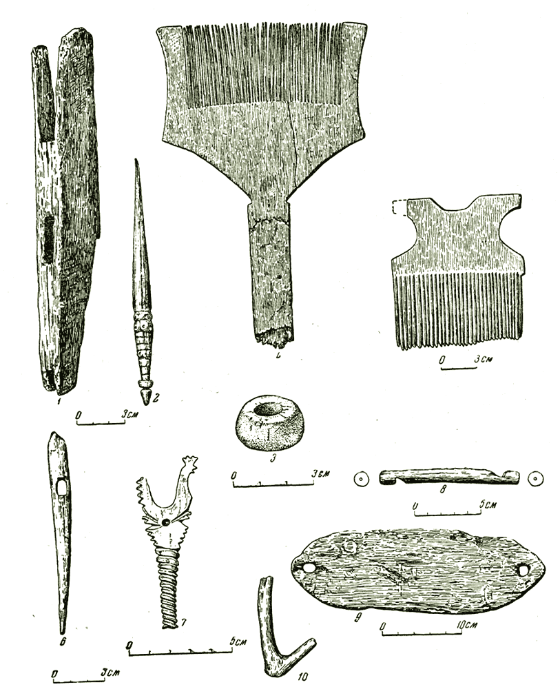 1 - часть льномялки; 2 - веретено; 3 - шиферное пряслице; 4 - гребень от прялки; 5 - гребенка для расчесывания льна, конопли и шерсти; 6 - игла для плетения; 7 - шпилька от прялки; 8 - юрок; 9 - педаль от прялки; 10 - крюк от ткацкого станка