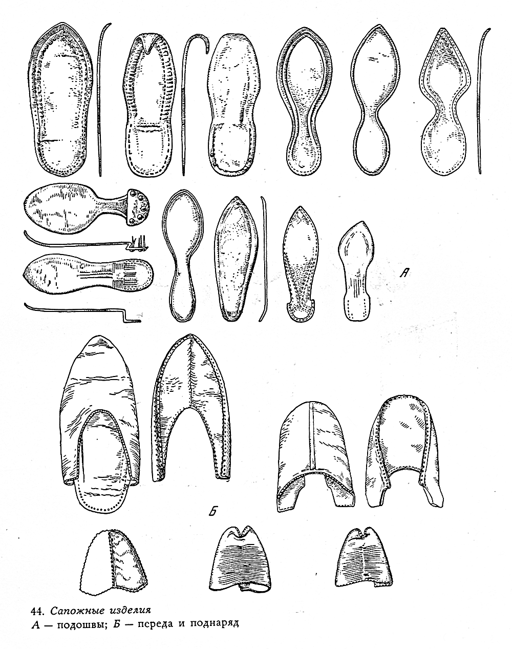 Сапожные изделия: 1-4 - каблуки и подковки; 5-7 - задники и берестяные вкладыши; 8, 9 - голенища; 10 - носок поршня