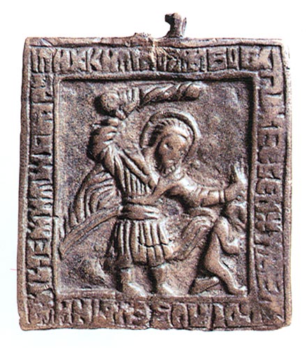 | Икона "Чудо Георгия о змие", 16 в. Литье просечное. 8,9х6,8х0,2