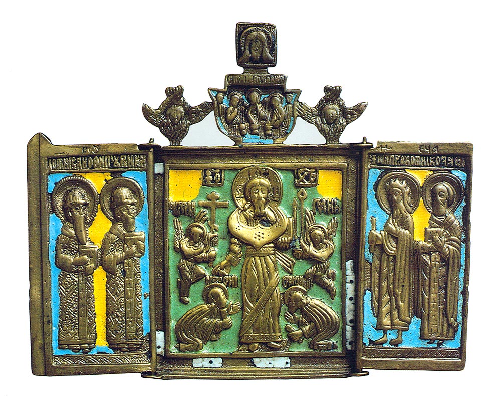 Складень трехстворчатый "Спас Смоленский. Избранные святые", 18 в. Медный сплав, литье, эмаль. 11,2х13,8х0,4
