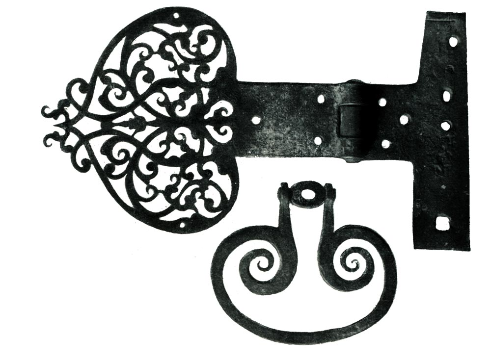 Кованая дверная петля-жиковина и дверная ручка. 17 в.