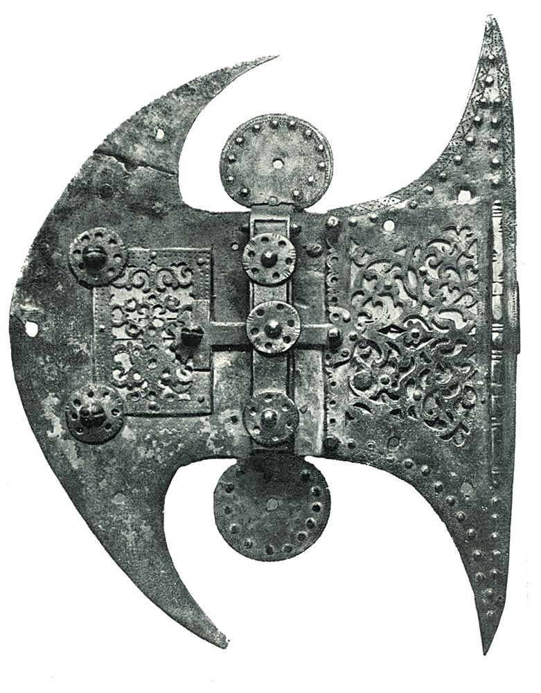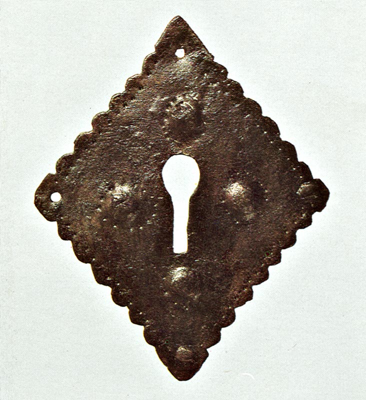 Личина нутряного замка. Орнамент нанесен техникой оловянной инкрустации. Железо, художественная ковка. Длина 15 см. 12 в.