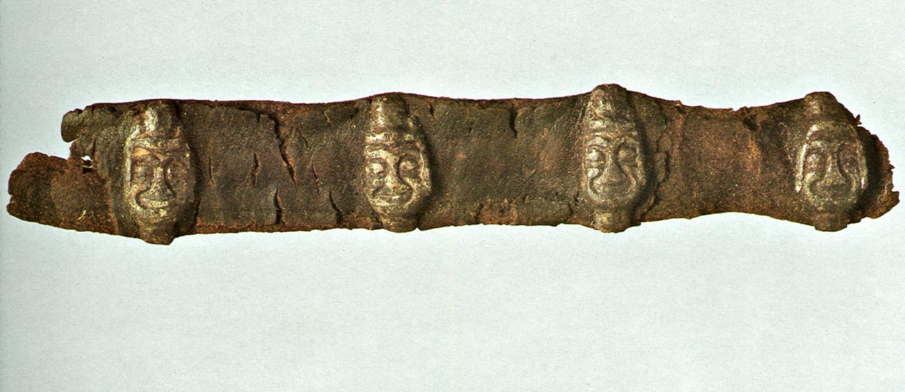 Обрывок кожаного пояса с накладками из бронзы в форме человеческих личин. Длина фрагмента 10,5 см. 15 в.