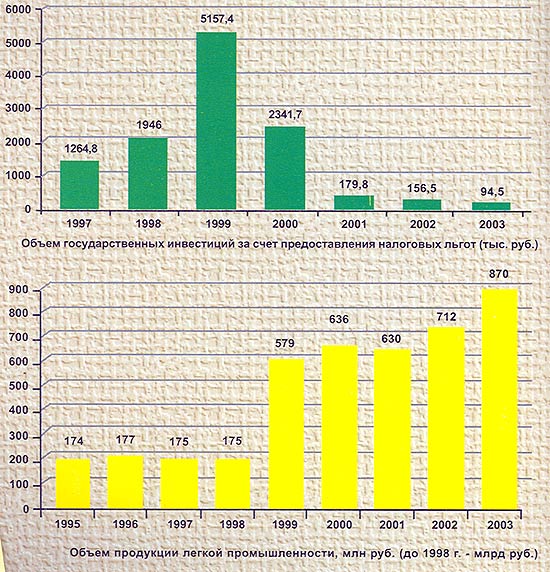 В связи с этим, руководством области, начиная с 1997 года проводится последовательная целенаправленная работа по возрождению льняного комплекса. В этих целях предприятиям легкой промышленности были предоставлены льготные условия по уплате налогов, проведена реструктуризация кредиторской задолженности, выполнены организационно-правовые мероприятия. Фактически за счет налоговых льгот предприятия легкой промышленности получили государственные безвозмездные инвестиции на сумму 11 миллионов рублей.