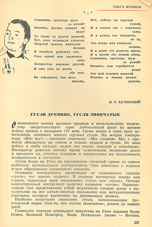 «Слышишь трактора шум за рекой?..» / О. Фокина // Молодая гвардия. – 1961. – № 7. – С. 307 : ил.
