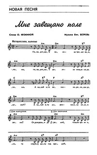 Ветров В. Мне завещано поле [Ноты] : «Говорят, мое поле…» / Вяч. Ветров ; сл. О. Фокиной // Наш современник. – 1979. – № 10. – С. 190–191.