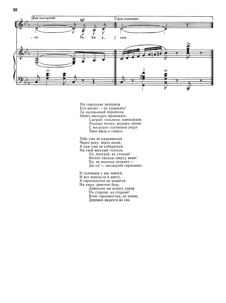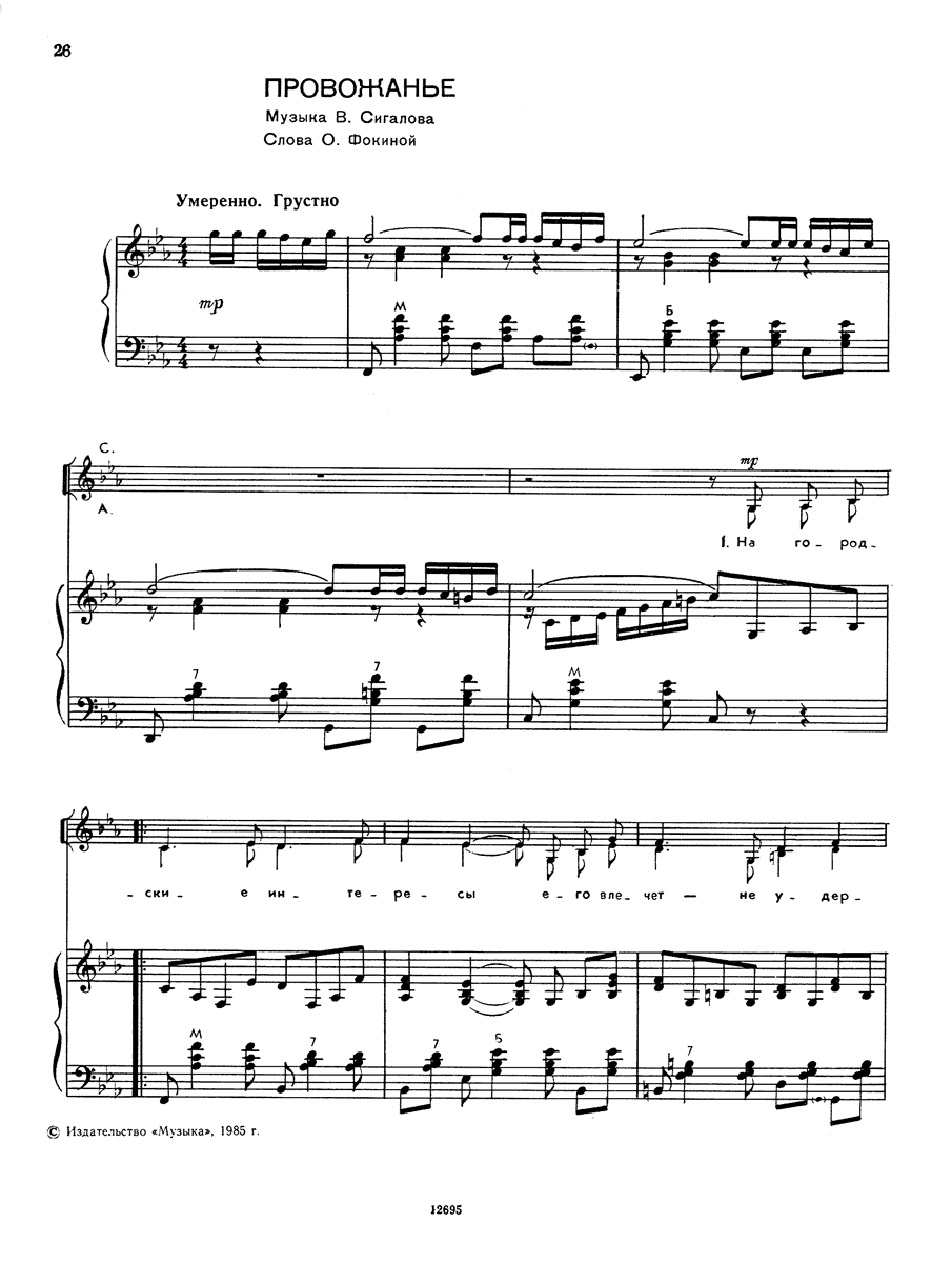 | Сигалов В. Провожанье [Ноты] : «На городские интересы...» / В. Сигалов ; сл. О. Фокиной // Поет Государственный Сибирский русский народный хор : без сопровожд. и в сопровожд. баяна / сост. В. Мочалов. – Москва, 1985. – С. 26–28. |
