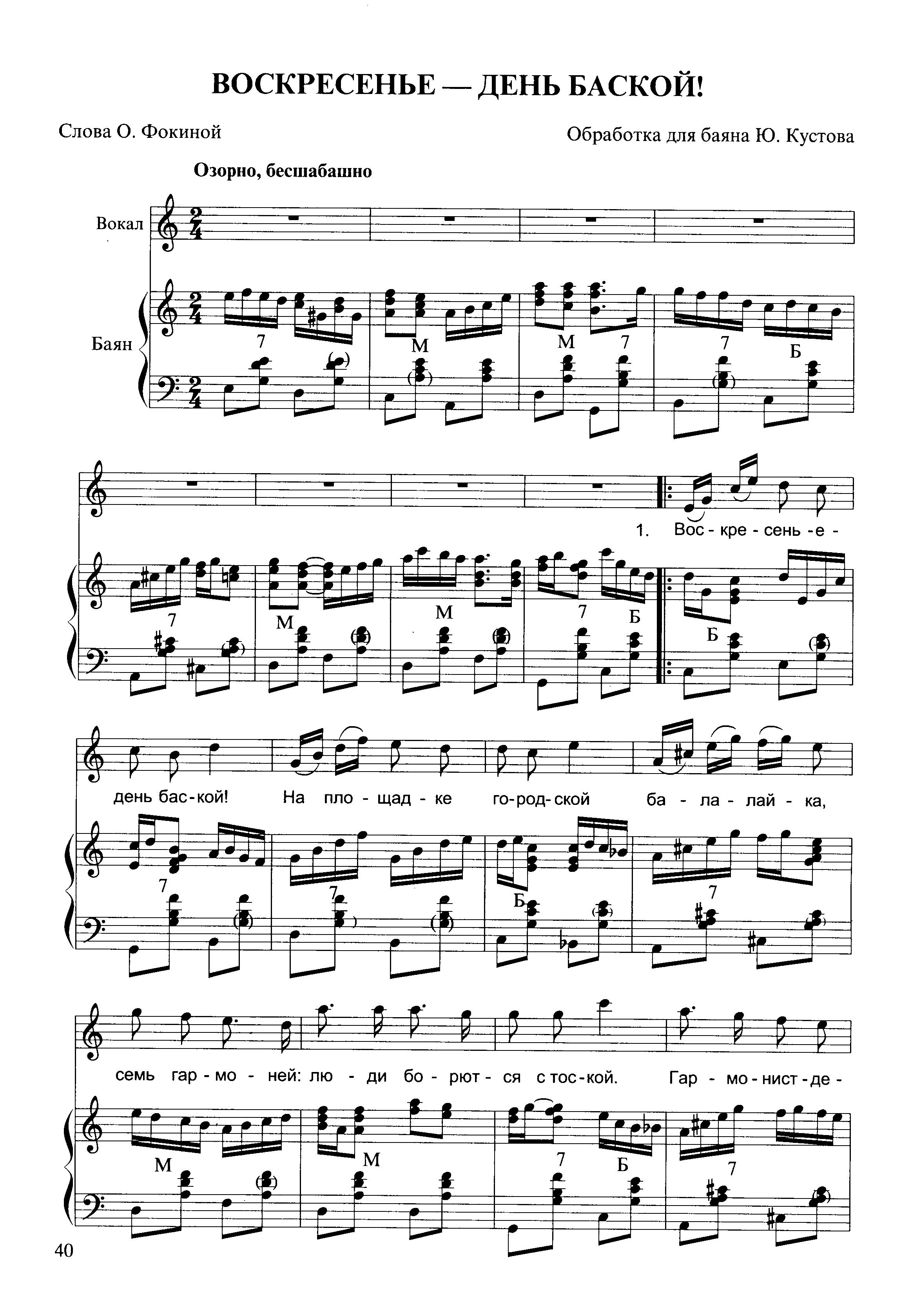 Из содерж.: За той за Тоймой : «Зеленой поймой струится Тойма…» / сл. О. Фокиной ; обраб. для баяна Ю. Волкова. – С. 37–39 ; Воскресенье – день баской! : «Воскресенье – день баской!..» / сл. О. Фокиной ; обраб. для баяна Ю. Кустова. – С. 40–42. |