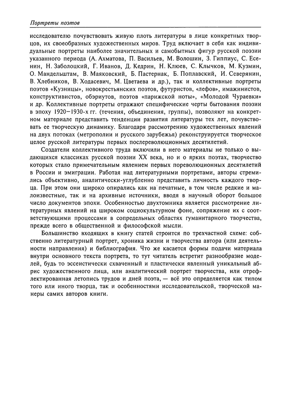 Коллективный труд, подготовленный Отделом новейшей русской литературы Института мировой литературы им. А. М. Горького, – это история русской литературы 1920–1930-х гг. в портретах поэтов. Два тома издания включают в себя статьи о наиболее крупных и значительных фигурах русской поэзии указанного периода (А. Ахматова, П. Васильев, М. Волошин, З. Гиппиус, С. Есенин, Н. Заболоцкий, Г. Иванов, Н. Клюев, С. Клычков, М. Кузмин, О. Мандельштам, В. Маяковский, Б. Пастернак, Б. Поплавский, И. Северянин, В. Хлебников, В. Ходасевич, М. Цветаева и др.), литературные портреты поэтов, творчество которых стало примечательным явлением первых пореволюционных десятилетий в России и эмиграции (Э. Багрицкий, М. Исаковский, Д. Кедрин, Н. Туроверов, В. Смоленский и др.), а также коллективные портреты поэтов «Кузницы», новокрестьянских поэтов, футуристов, «лефов», имажинистов, конструктивистов, обэриутов, поэтов «парижской ноты», «Молодой Чураевки» и др.