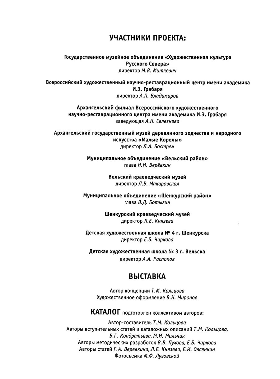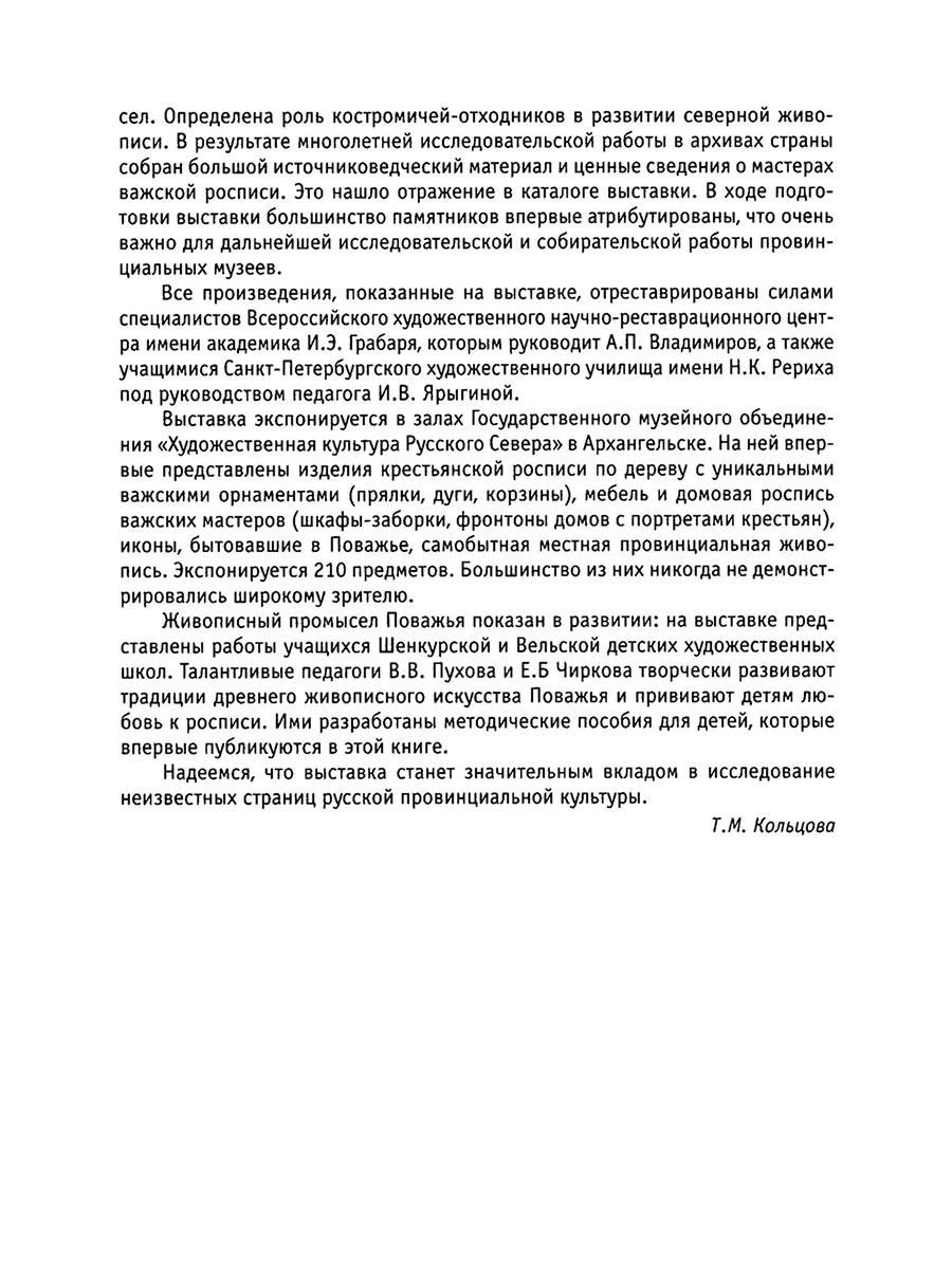 Крестьянская живопись Поважья : из собрания музеев Архангельской области : каталог / авт.-сост. Т. М. Кольцова; авт. вступ. ст. и каталож. описаний: Т. М. Кольцова и др.]. – М. : Сев. паломник, 2003. – 366 с. : ил.