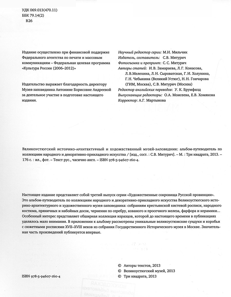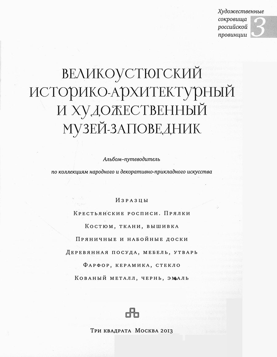 Великоустюгский историко-архитектурный и художественный музей-заповедник : альбом-путеводитель по коллекциям народного и декоративно-прикладного искусства / [изд., сост. С. В. Митурич]. – М. : Три квадрата, 2013. – 174, [2] с. : цв. ил.