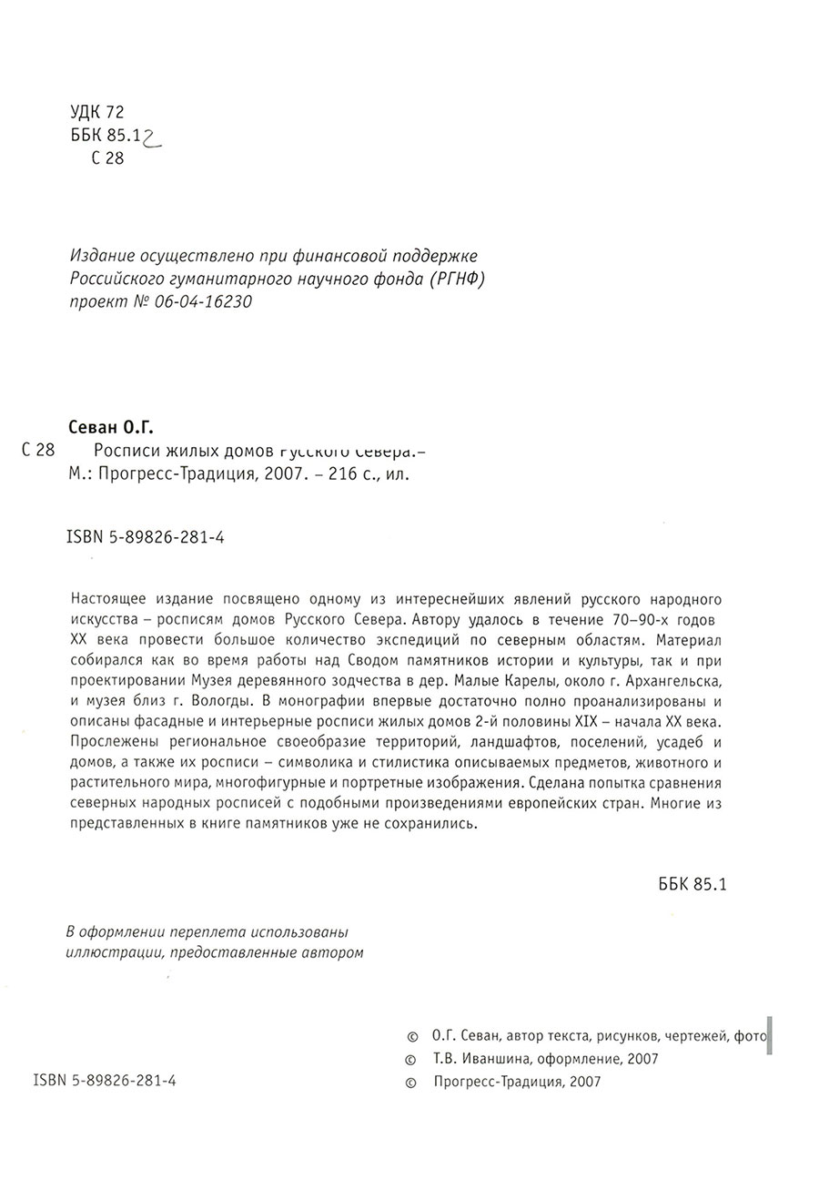 Севан О. Г. Росписи жилых домов Русского Севера / О. Севан. – М : Прогресс-Традиция, 2007. – 215 с. : ил., цв. ил.