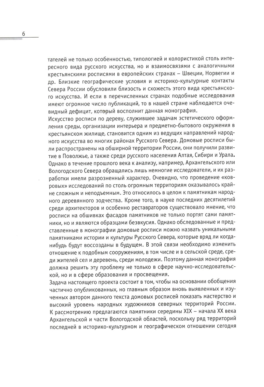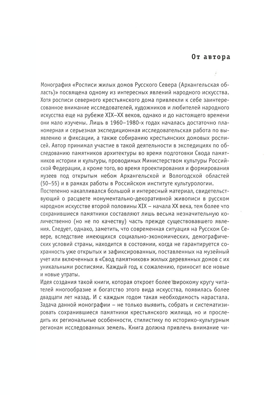 Настоящее издание посвящено одному из интереснейших явлений русского народного искусства – росписям домов Русского Севера. Автору удалось в течение 70-90-х годов XX века провести большое количество экспедиций по северным областям. Материал собирался как во время работы над Сводом памятников истории и культуры, так и при проектировании Музея деревянного зодчества в дер. Малые Карелы, около г. Архангельска, и музея близ г. Вологды. В монографии впервые достаточно полно проанализированы и описаны фасадные и интерьерные росписи жилых домов 2-й половины XIX – начала XX века. Прослежены региональное своеобразие территорий, ландшафтов, поселений, усадеб и домов, а также их росписи – символика и стилистика описываемых предметов, животного и растительного мира, многофигурные и портретные изображения. Сделана попытка сравнения северных народных росписей с подобными произведениями европейских стран. Многие из представленных в книге памятников уже не сохранились.