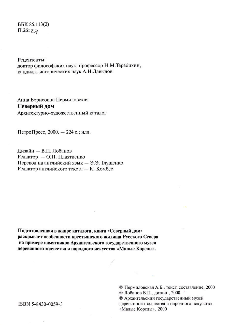 Пермиловская А. Б. Северный дом=The northern house : архитектурный каталог [памятников музея «Малые Корелы»] / А. Б. Пермиловская. – Петрозаводск : ПетроПресс, 2000. – 223 с. : ил.