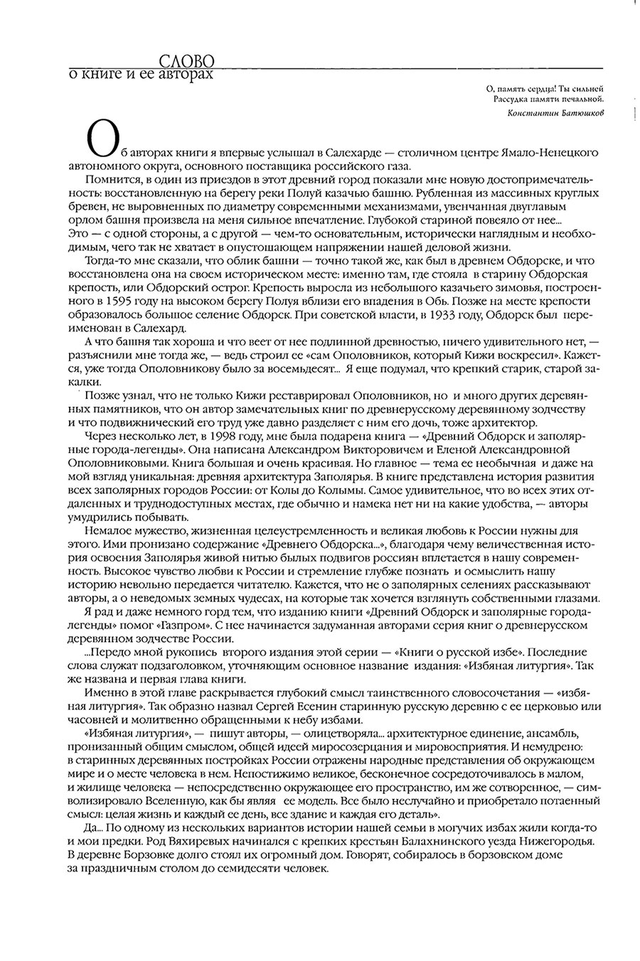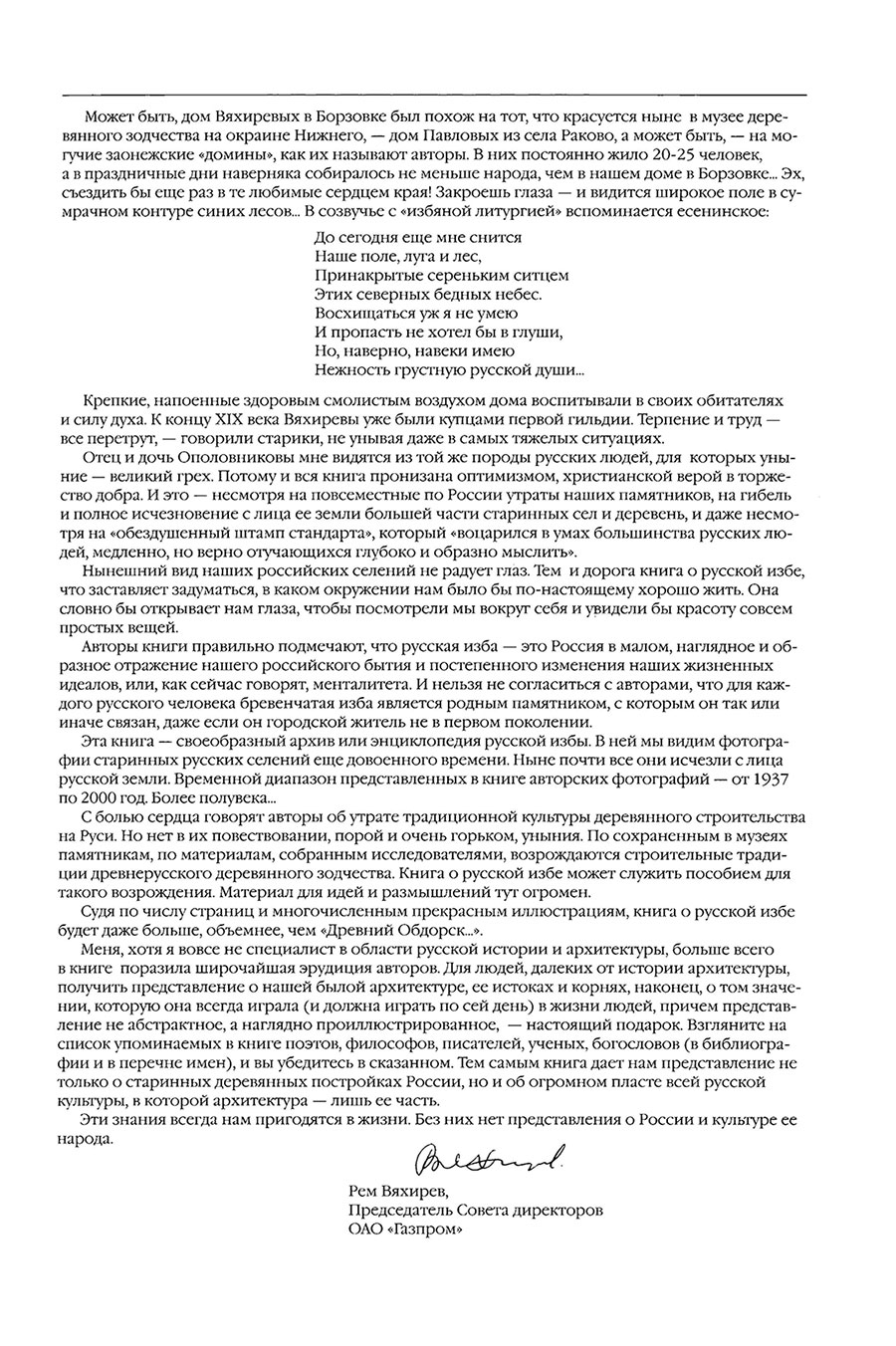 На основе огромного уникального фактического материала (графические и живописные реконструкции, цветные и черно-белые фотографии) рассматриваются особенности построения русских изб и традиционных поселений – во взаимосвязи с религиозно-философским мировосприятием нашего народа. Особое внимание уделено архитектурным деталям. Большая часть памятников уже исчезла с лица земли. Само понятие «русская изба» включает не только архитектурно-конструктивные приемы строительства, но и образ жизни как систему эстетических и этических взглядов, вскормленных русской землей и Православной верой. Возрождение основывается не на копировании форм и обрядоверии, а на осмыслении содержания архитектурных образов и самой идеи жизни. Повествование ведется многопланово с ассоциативными экскурсами в далекую и близкую историю России. Развитие архитектурной мысли переплетается с историко- философской. Для всех, кого интересует история русской жизни и ее отражение в самобытных образах древнерусского деревянного зодчества. Издание историко-просветительное.
