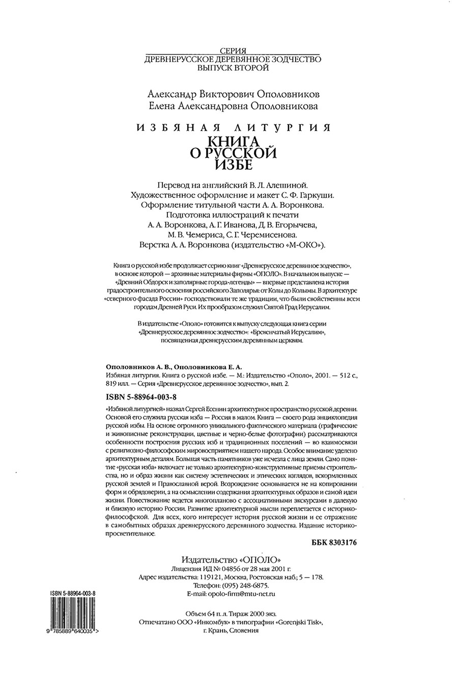 Ополовников А. В. Избяная литургия : книга о русской избе / А. В. Ополовников, Е. А. Ополовникова. – М. : Ополо, 2002. – 510 с. : ил. – (Серия «Древнерусское деревянное зодчество»; Вып. 2).