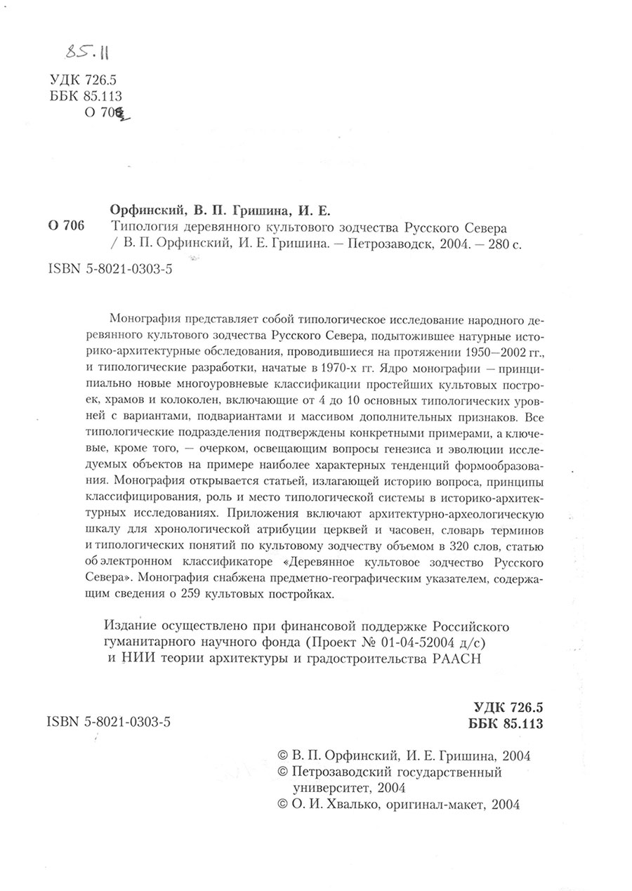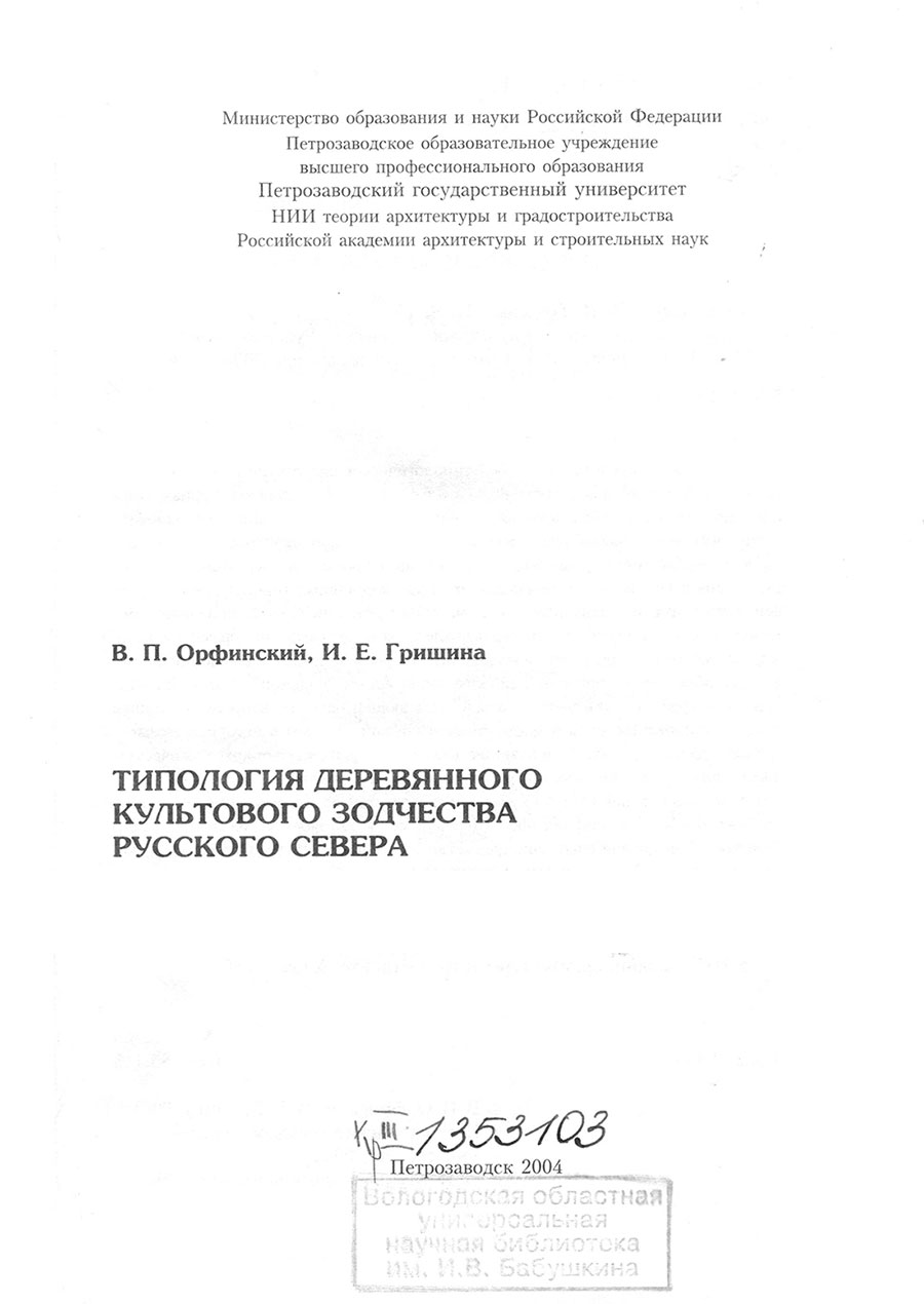 Орфинский В. П. Типология деревянного культового зодчества Русского Севера / В. П. Орфинский, И. Е. Гришина. – Петрозаводск : ПетрГУ, 2004. – 278 с. : ил., карт.