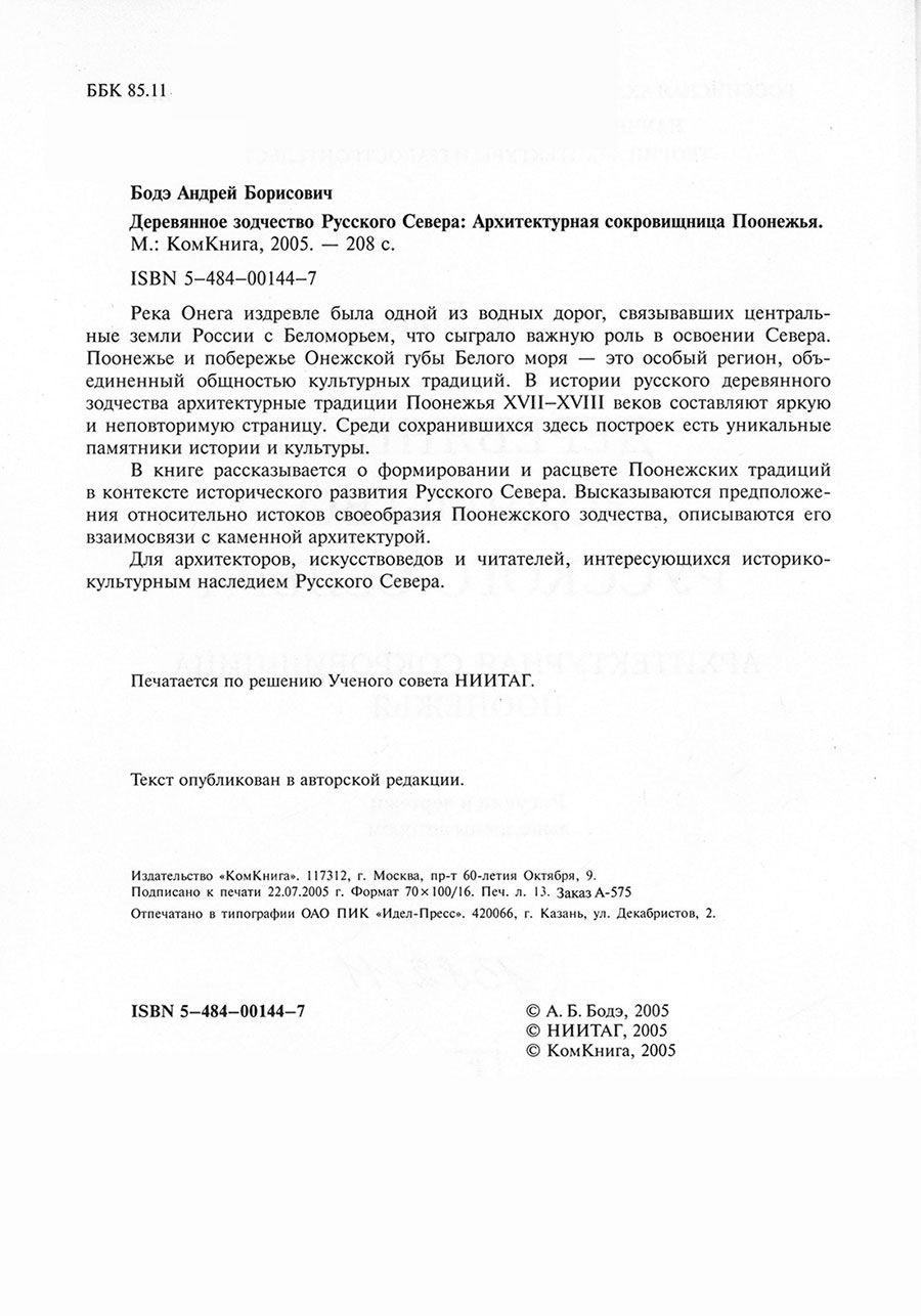 Бодэ А. Б. Деревянное зодчество Русского Севера : архитектурная сокровищница Поонежья : [с рис. и черт. авт.] / А. Б. Бодэ. – М. : КомКнига, 2005. – 203 с. : ил., черт.