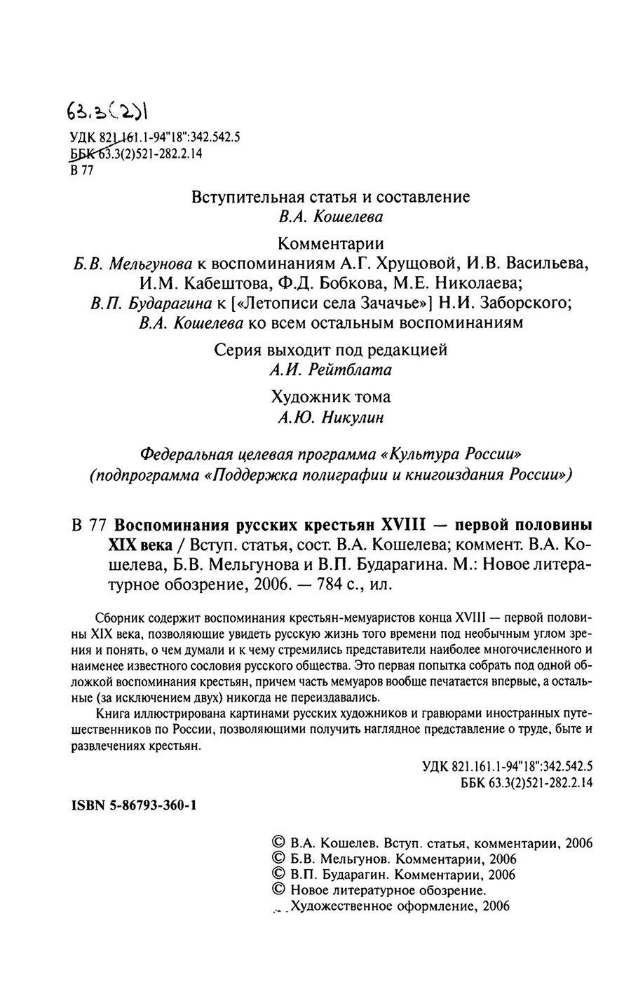 Воспоминания русских крестьян XVIII – первой половины XIX века / [вступ. ст. и сост. В. А. Кошелева]. – М. : Новое литературное обозрение, 2006. – 778, [2] с., [8] л. ил., портр., факс. : ил.