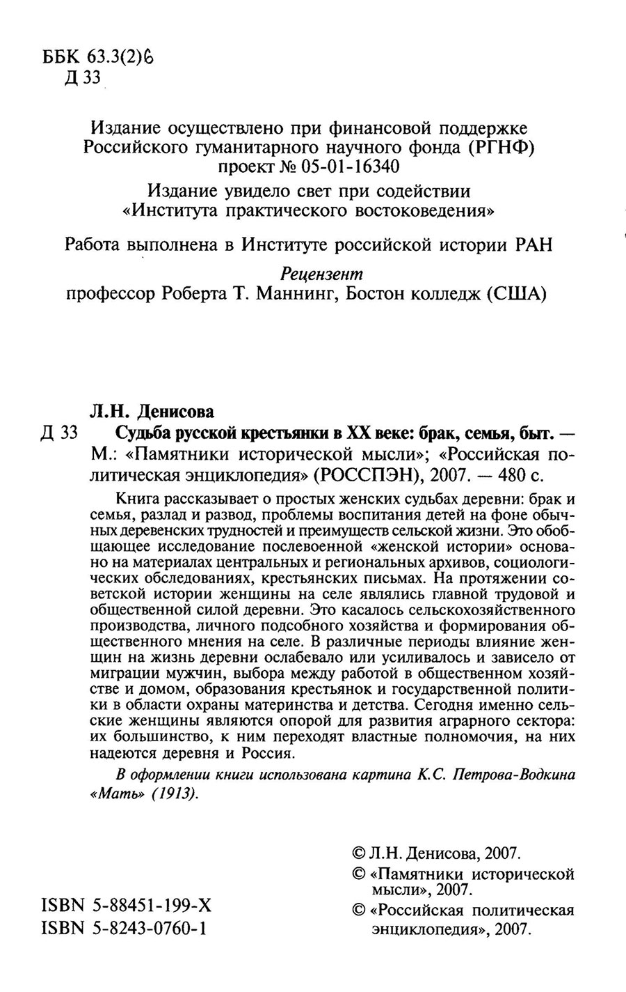 Денисова Л. Н. Судьба русской крестьянки в XX веке : брак, семья, быт / Л. Н. Денисова. – М. : Памятники ист. мысли : РОССПЭН, 2007. – 476, [3] с. : табл.
