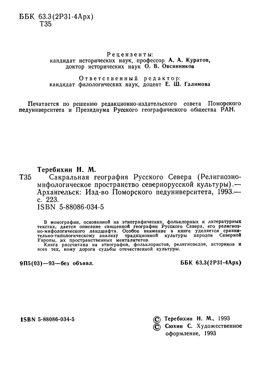 Теребихин Н. М. Сакральная география Русского Севера : (религиозно-мифологическое пространство севернорусской культуры) / Н. М. Теребихин. – Архангельск : Поморский междунар. пед. ун-т им. М. В. Ломоносова, 1993. – 220 с.