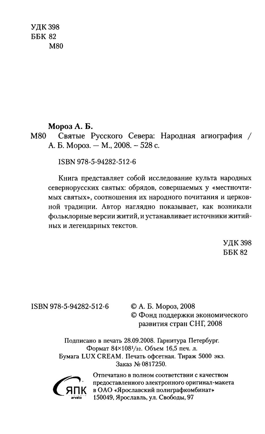 Мороз А. Б. Святые Русского Севера : народная агиография / А. Б. Мороз. – М. : Фонд поддержки экономического развития стран СНГ, 2008. – 525 с.