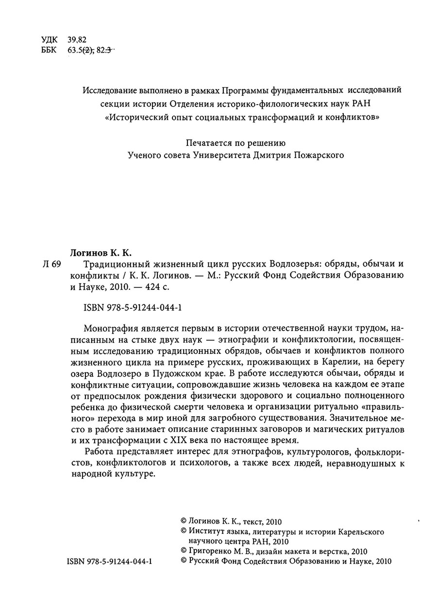Логинов К. К. Традиционный жизненный цикл русских Водлозерья : обряды, обычаи и конфликты / К. К. Логинов. – М. ; Петрозаводск : Ун-т Дмитрия Пожарского, 2010. – 412 с. : ил., карт.