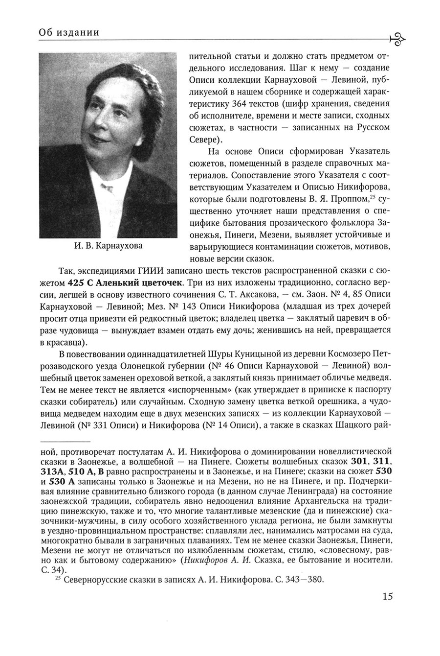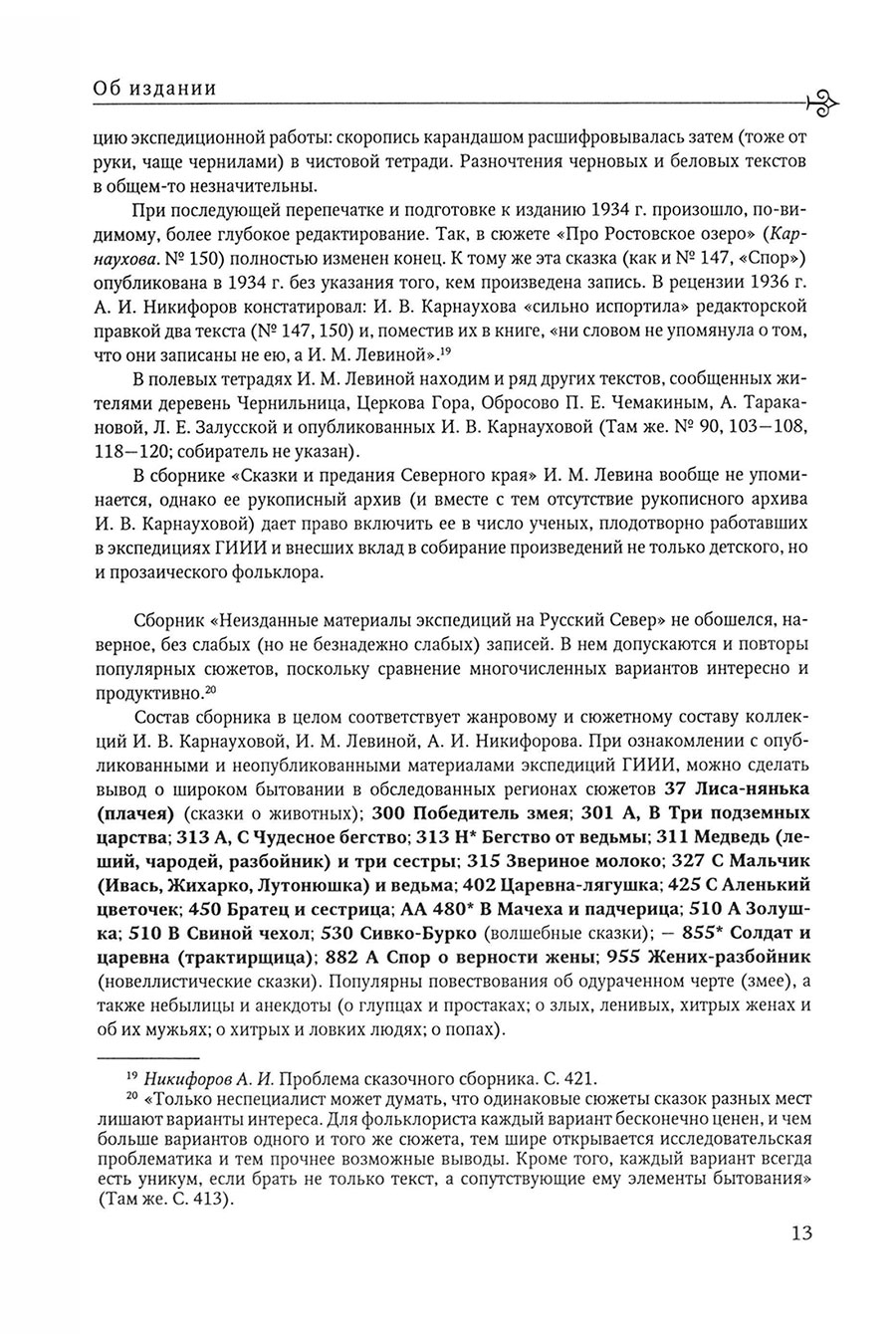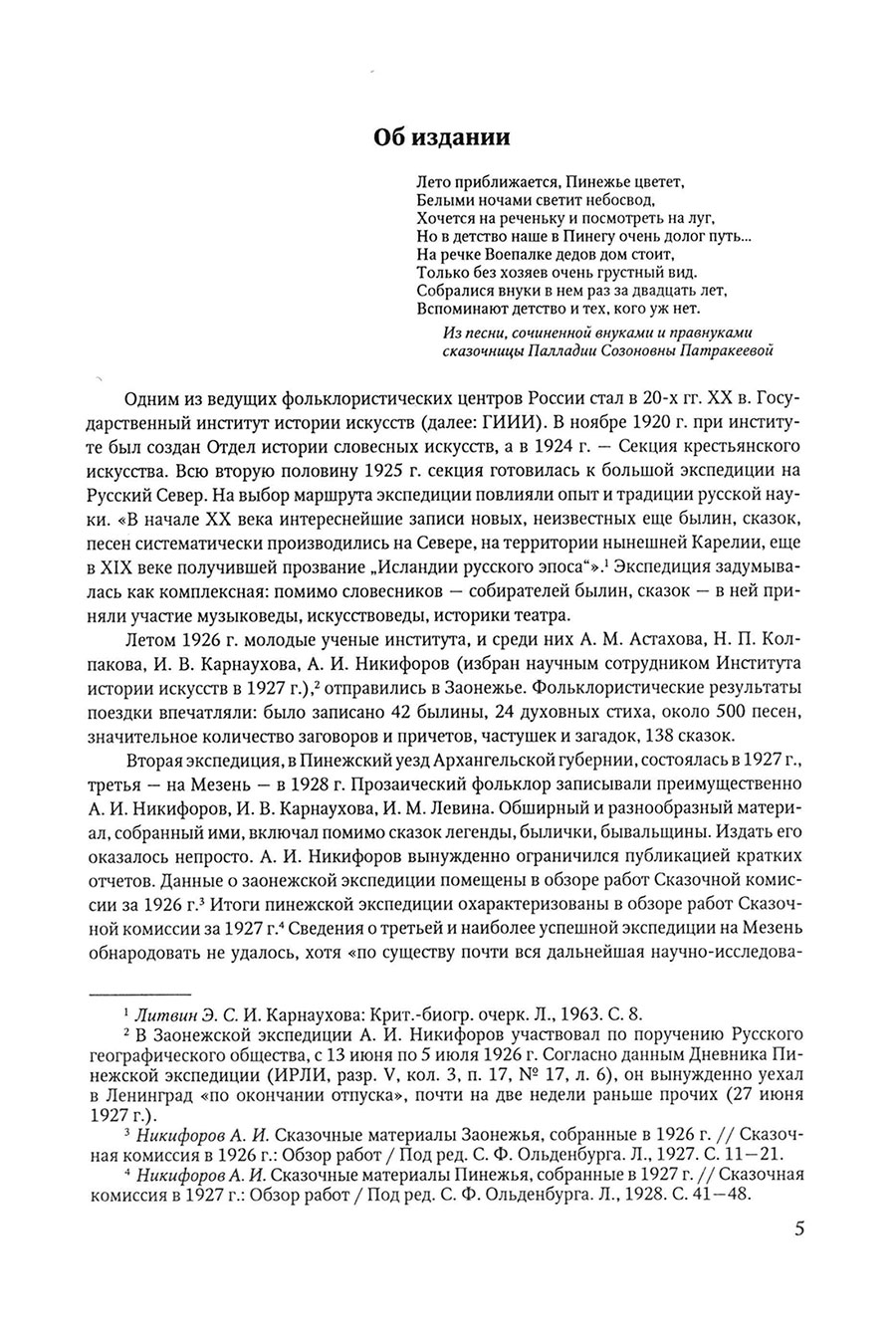 Сборник включает более пятисот ранее не публиковавшихся записей, которые были сделаны в Заонежье, на Пинеге и Мезени талантливыми фольклористами-собирателями – А. И. Никифоровым, И. В. Карнауховой, И. М. Левиной. 1920-е годы, когда проводились фольклорные экспедиции, – время полноценной, богатой жизни русской народно-поэтической традиции. В книгу вошли сказки, легенды, былички, загадки, произведения детского фольклора. Сборник снабжен вступительной статьей, характеризующей его жанровый и сюжетный состав, а также развернутыми комментариями к текстам и Описью собрания прозаического фольклора И. В. Карнауховой, И. М. Левиной, впервые осуществленной. Материалы сборника расширяют представления о фольклорной традиции Русского Севера, о мироощущении и творчестве народа в один из переломных периодов российской истории. Вошедшие в книгу сказки, загадки, колыбельные предназначены для широкого круга заинтересованных читателей.