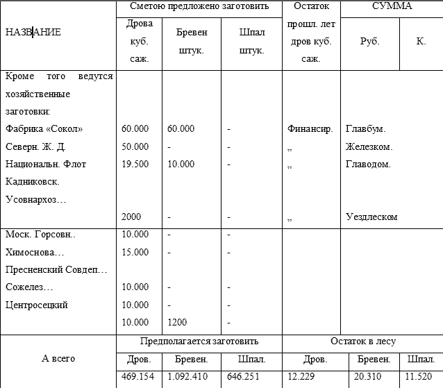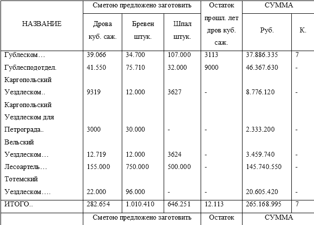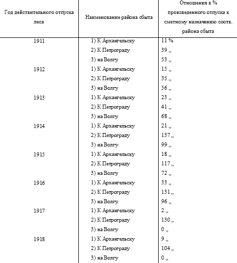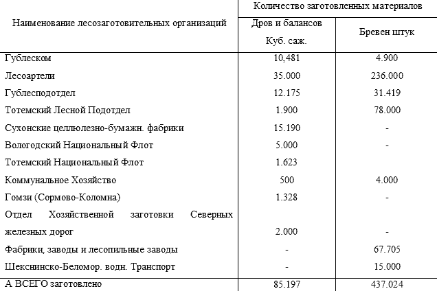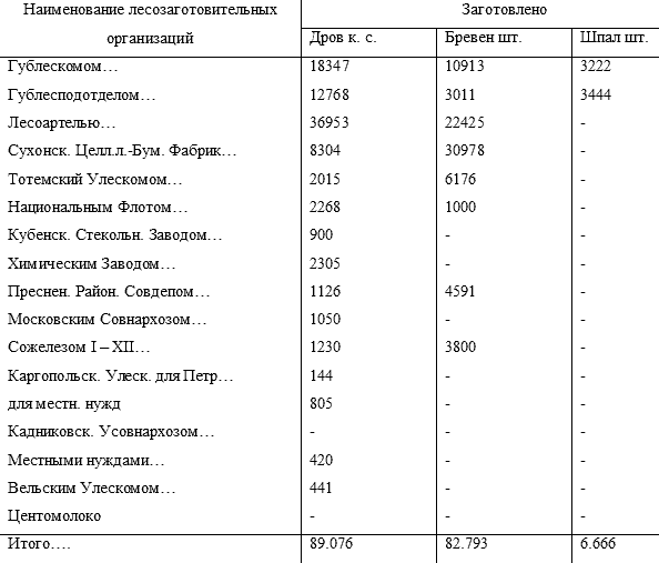 Видное место в заготовке леса и отпуске его за пределы губернии играла хозяйственная заготовка леса лесо-заготовительным аппаратом бывш. Вологодского Управления Земледелия и Гос. Им., как это видно из нижеприведенной таблицы: