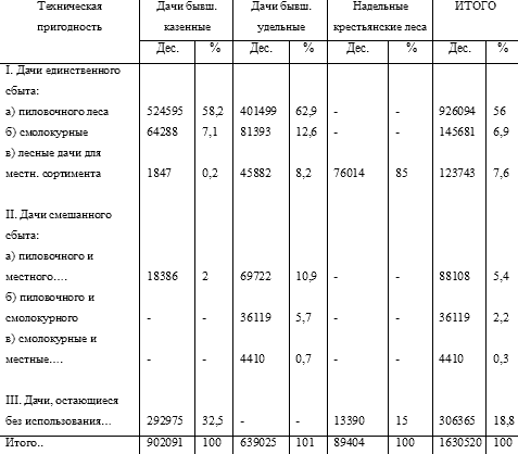 Из этой таблицы, между прочим, видно, что пригодными для выращивания пиловочного леса в бывш. казенных дачах признается более 1/2 лесонасаждений, а в бывш. удельных свыше 3/4 всей площади лесов. Пригодных же для смолокурения является в бывших казенных дачах 7%, а в бывш. удельных около 18 % всей площади лесов.