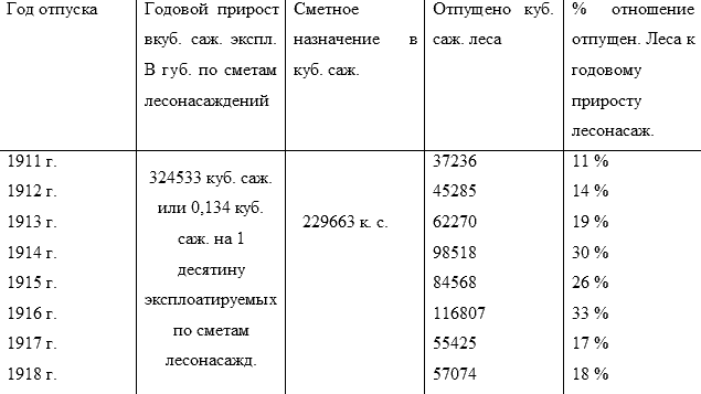 Кроме отпуска леса для удовлетворения нужд в лесных материалах местного населения, в период времени с 1911 по 1918 г. из бывш. казенных дач отпущено за пределы губернии следующее количество лесных материалов, указанное в нижепомещенной таблице:
