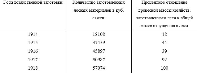 Из последней таблицы видно, что процентное отношение древесной массы хозяйственным способом заготовленного леса ко всей массе действительно отпущенного за пределы губернии леса в 1914 г., составлявшее всего 18, постепенно увеличивалось, достигнув в 1918 г. - 100 проц.