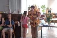 На открытие и встречу с художницей пришли дети старшей группы летнего лагеря, затем была организована такая же встреча с местными жителями. Особый интерес у ребят вызвали детские работы воспитанников Вожегодской школы искусств, в которой художница много лет преподавала изобразительное искусство.