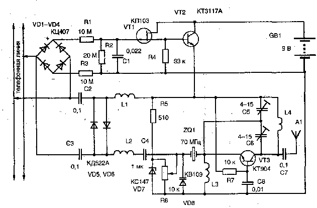 Рис. 12 - r266.tif Телефонный радиожучок с кварцевой стабилизацией частоты, дающий излучение лишь при снимании телефонной трубки. Диапазон: 65-108 МГц (зависит от частоты кварцевого резонатора); дальность: до 600 м; антенна: кусок провода 30-50 см, свернутый спирально, L1-7В 0,8 d=8 мм, L1-L2 - 100В 0,1 на МЛТ 0,25> 100 кОм; 7 витков провода ПЭЛ 0,8 (или аналогичного), диаметр катушки 8 мм.