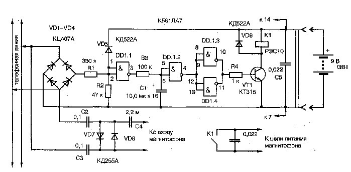 Рис. 14 - r269.tif Схема автоматического запуска магнитофона в момент снятия телефонной трубки