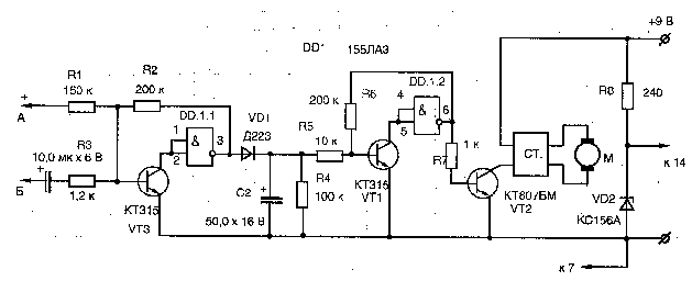 Рис. 15 - r270.tif Схема, включающая магнитофон при появлении звуков голоса (встраивается в магнитофон, врезаясь в цепь питания (стабилизатора) двигателя; "А" и "Б"-к переключателю рода работы, чтобы на "А" подавался "+" при "воспроизведении" и "перемотке" , а на "Б" - сигнал с выхода усилителя записи.)