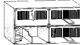 Отделение питомника для племенного поголовья оборудуют полками, на которые устанавливают гнезда, и насестами. Наиболее удобно оборудовать полки так, чтобы они могли служить паровочным ящиком, местом для установки гнезд, выведения потомства и насестом (рис. 132). Длина полок 70-80 см, ширина и высота 30-40 см. Можно изготавливать отдельные ящики такого же размера и устанавливать их в питомнике один на другой - стенкой (рис. 133). Когда голубка кормит птенцов и готовит следующую кладку яиц, клетку перегораживают на две половины съемной перегородкой высотой 15 см. В свободную половину ставят гнездо. Для удобства обслуживания гнезд передняя их стенка должна свободно открываться.