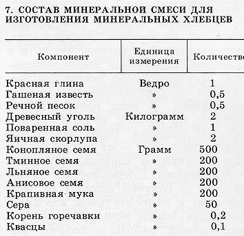 Смесь минерального корма может быть приготовлена из 4 частей крошки красного кирпича, 2 частей крошки старой штукатурки, 1 части яичной скорлупы, 1 части мясокостной муки, 1 части крупного речного песка и 1 части смеси углекислого кальция, медного и железного купороса и сернокислого кобальта. Все это хорошо перемешивают и поливают водным раствором поваренной соли в пропорции 20 г на 1 л воды. В таблице 7 приведен рецепт Н. А. Васильева и Н. С. Деркача для изготовления минеральных хлебцев.