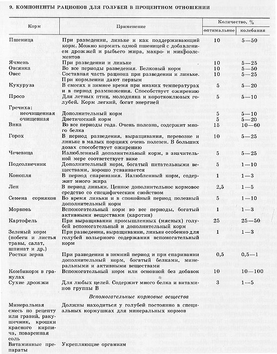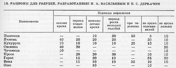 Голубеводы обычно составляют рационы исходя из наличия компонентов для этого. Рекомендуется придерживаться рационов, предложенных Н. А. Васильевым и Н. С. Деркачом (табл. 10).