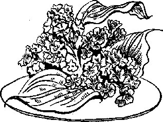 В сосуд поместить наколку. Расположить на ней слева белые левкои, справа - красные. Дополнить композицию листьями хосты. Один из листьев расположить так, чтобы не было видно сосуда (рис. 127). Такой композицией можно украсить праздничный стол.
